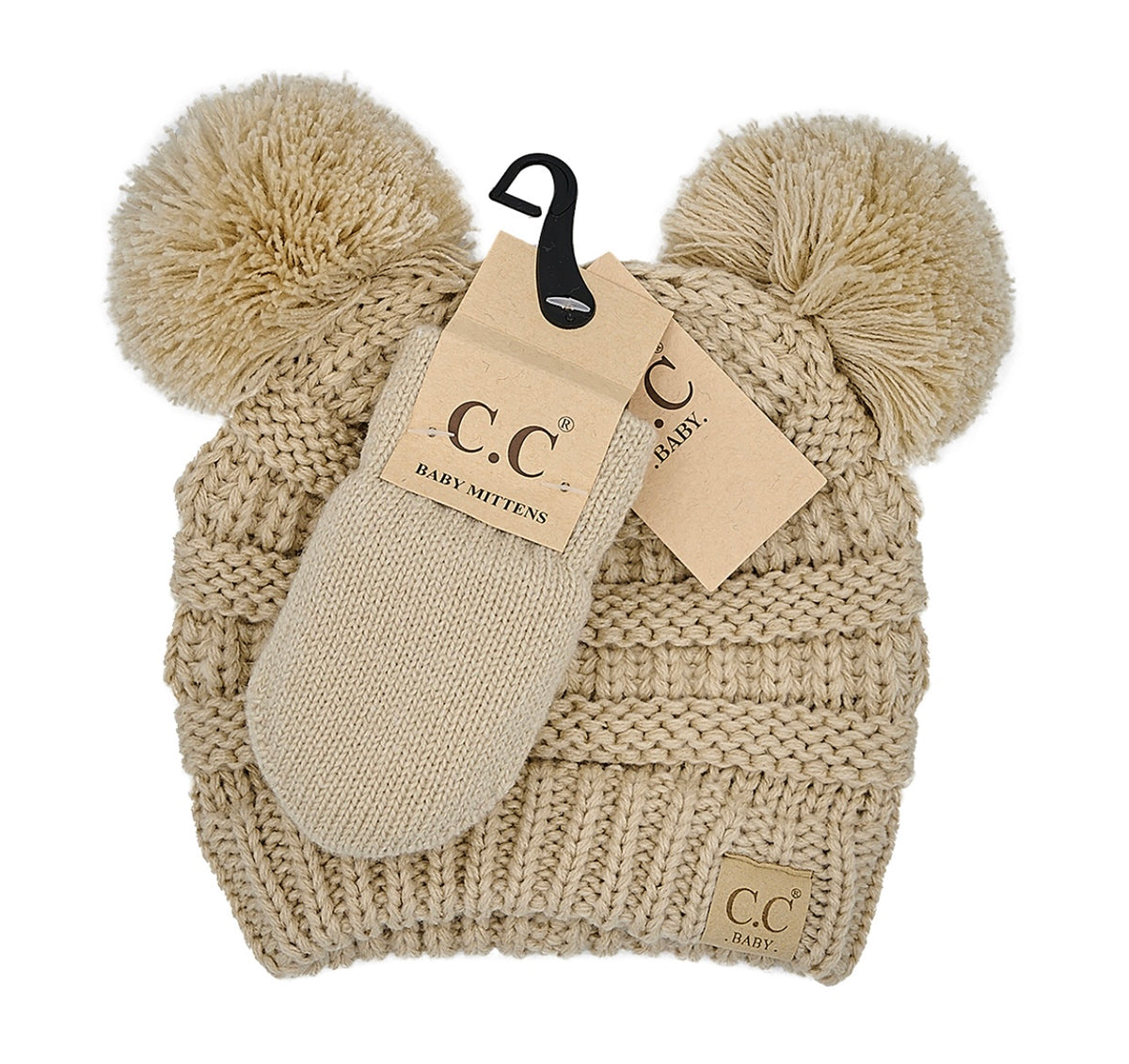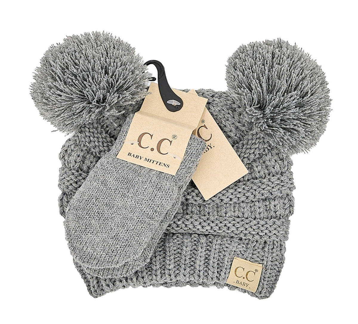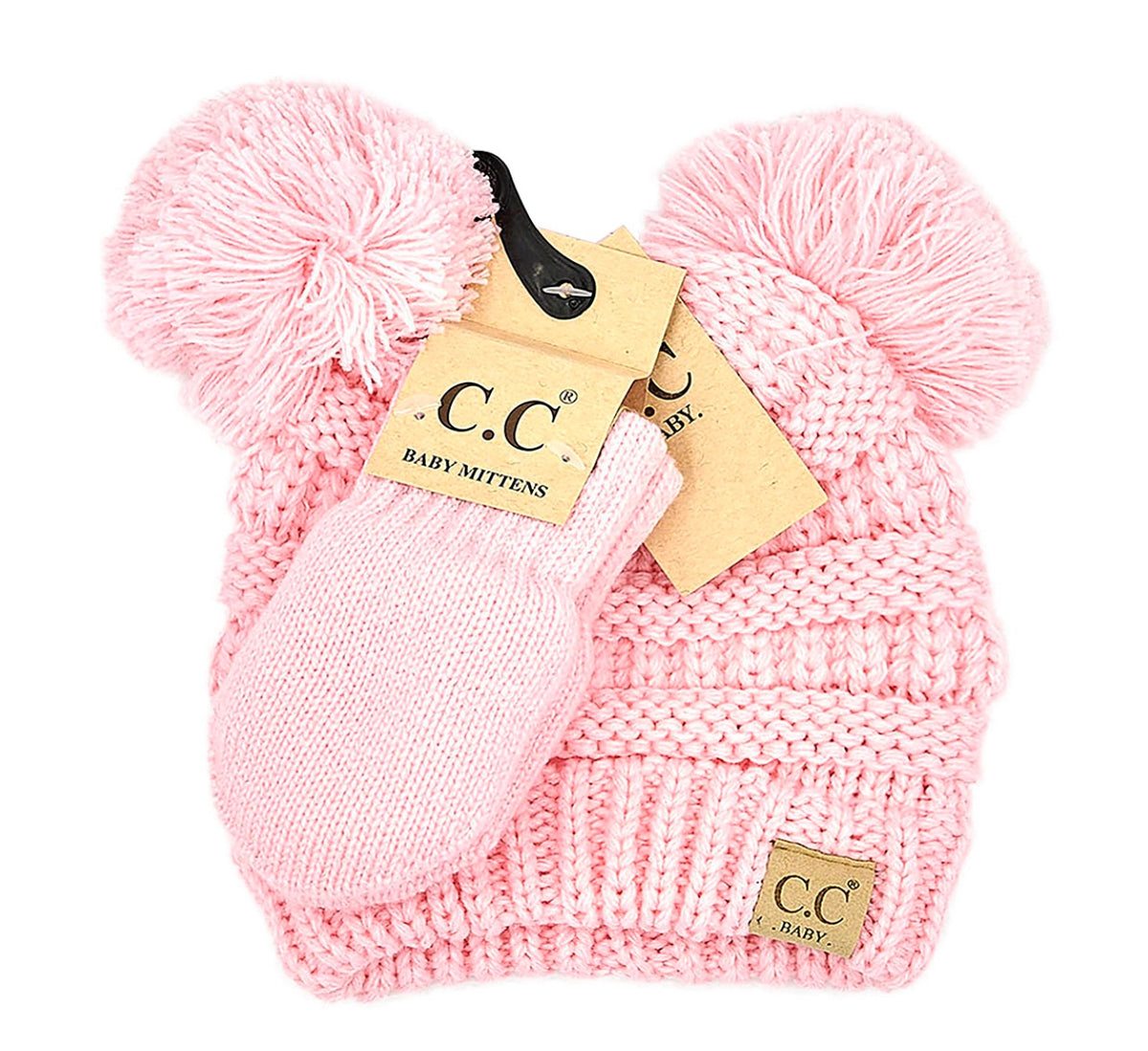 These baby sets are perfect for your newest member of the family!  They feature a classic knit C.C baby beanie and knit double poms with matching mittens that are fuzzy lined!