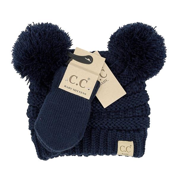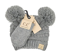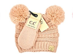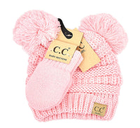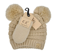 CC BEANIE: SOLID KNIT DOUBLE POM BEANIE WITH MITTEN SET