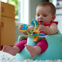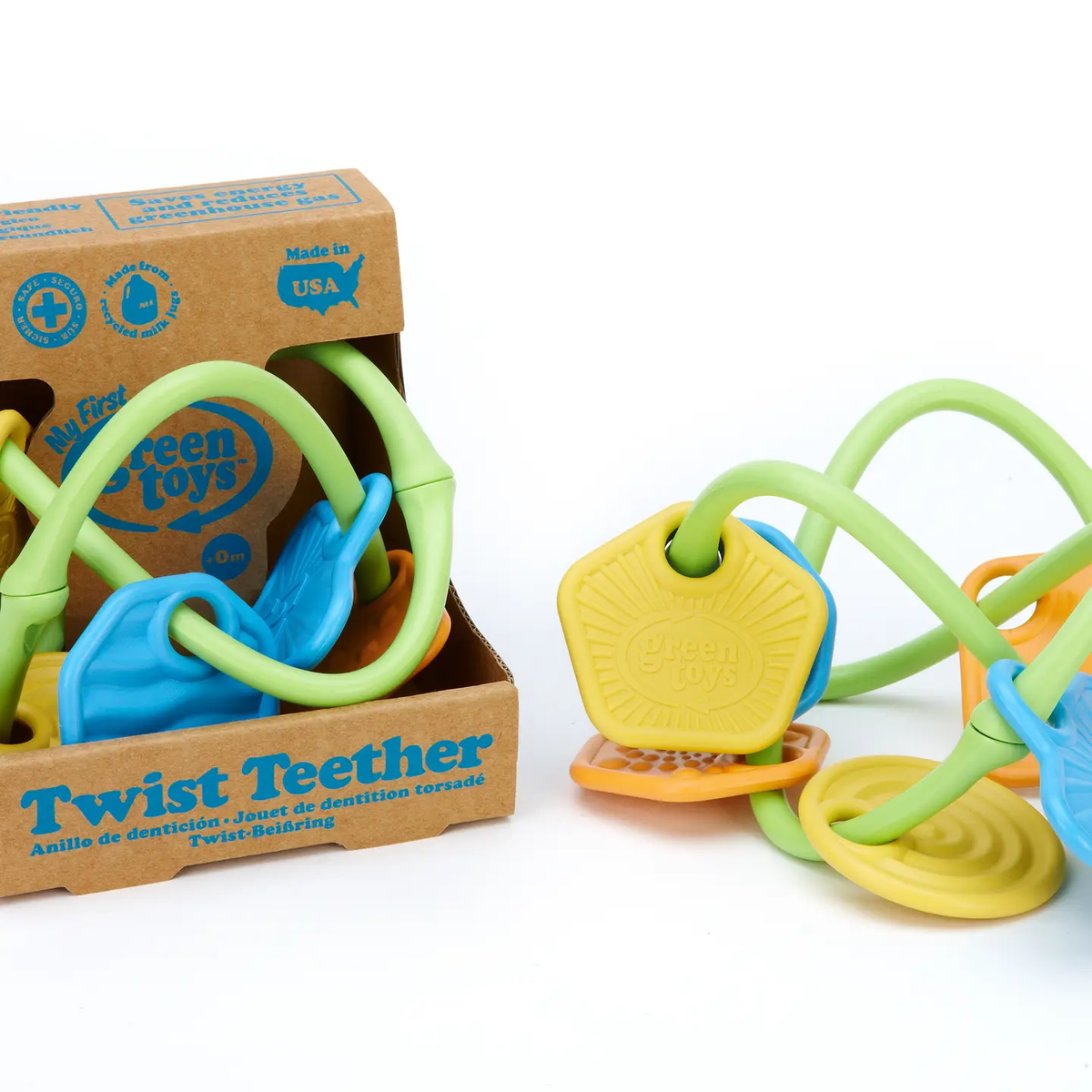 Shake, rattle and explore with the My First Green Toys™ Twist Teether. Tiny hands can easily grasp this lightweight, three dimensional, ultra-safe teether. Each uniquely shaped and colorful charm has a distinct texture to stimulate visual and tactile senses. Made in the USA from 100% food-safe recycled plastic milk containers that save energy and reduce greenhouse gas emissions. No BPA, PVC, phthalates, or external coatings. Meets FDA food contact standards. Dishwasher safe too. Color combinations may vary.