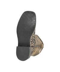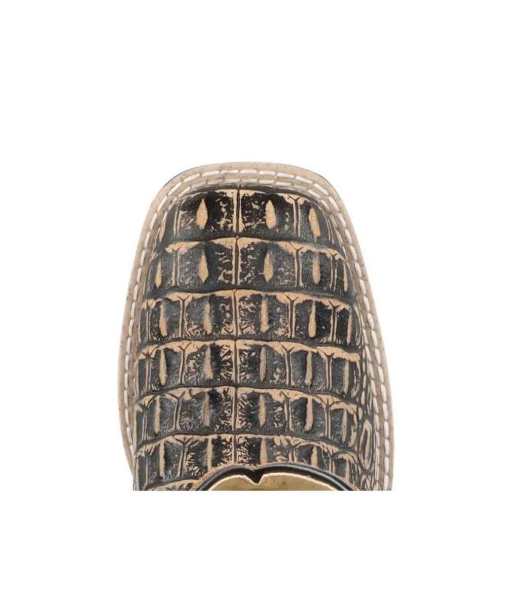 Sanded Black Gator Print Leather Foot; Brown Distressed Leather Upper; Leather Pull Tabs And Poles Holes For Easy On; Man-Made Lining; TPR Outsole; Block Heel; Square Toe; Style #3401C
